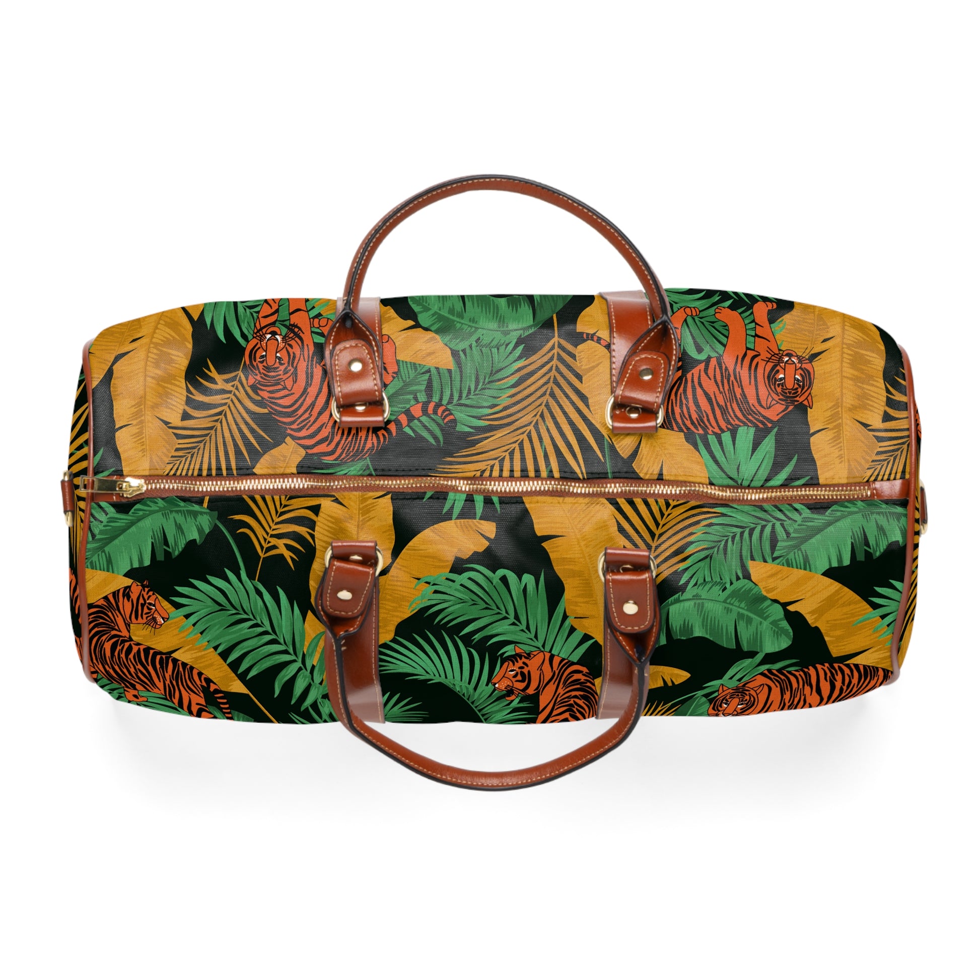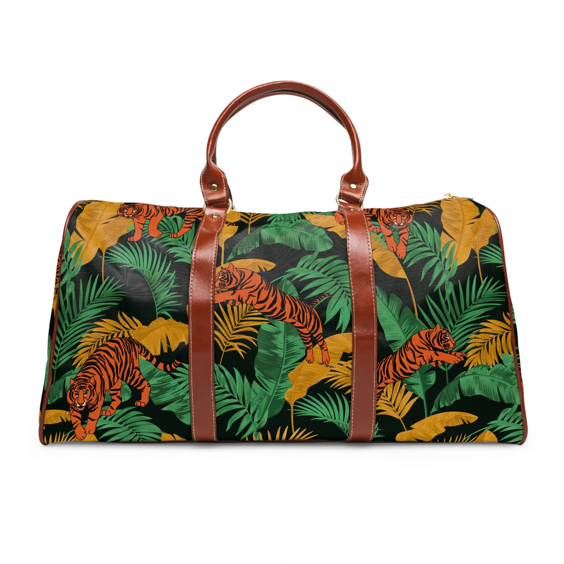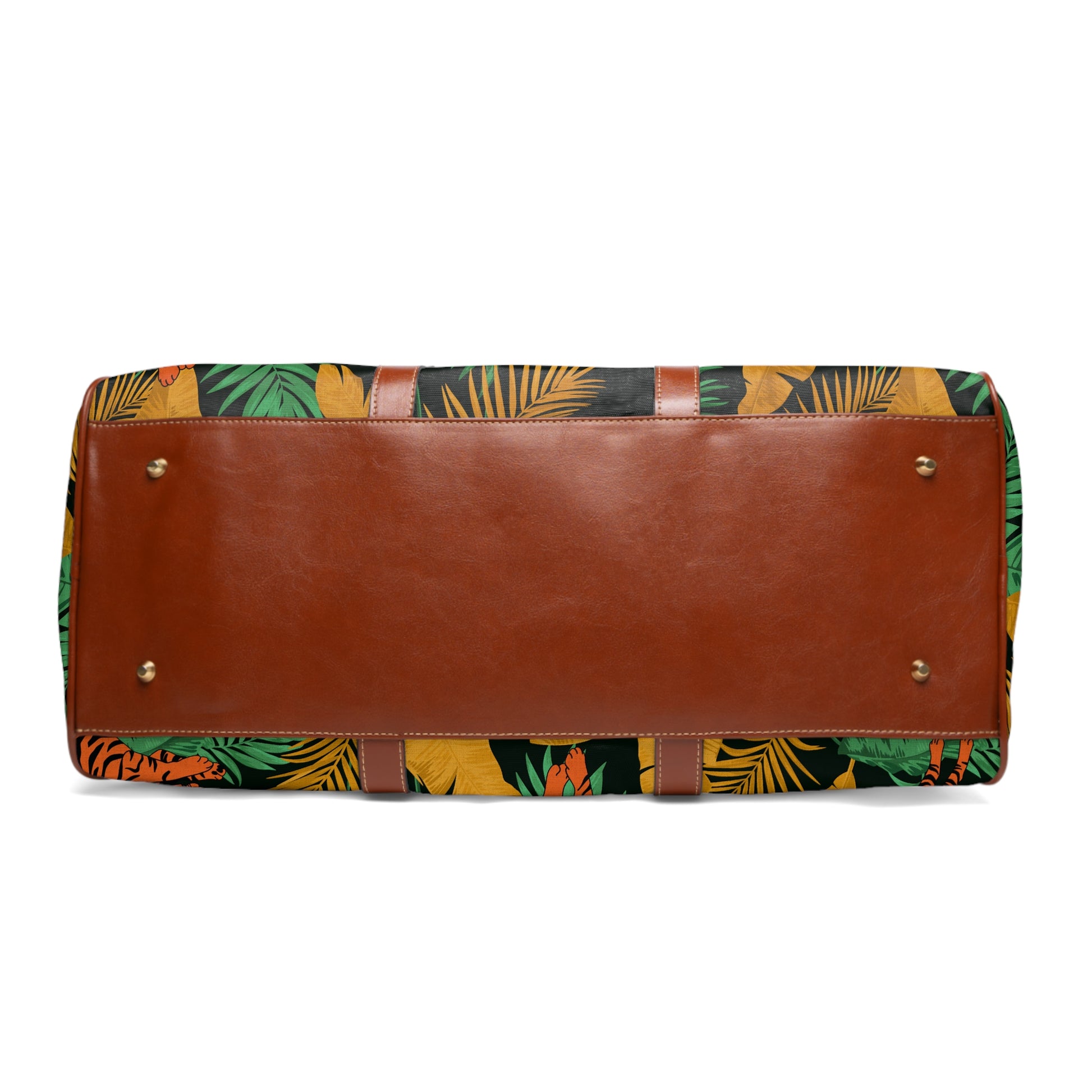 - Brown faux leather handles and an adjustable shoulder strap